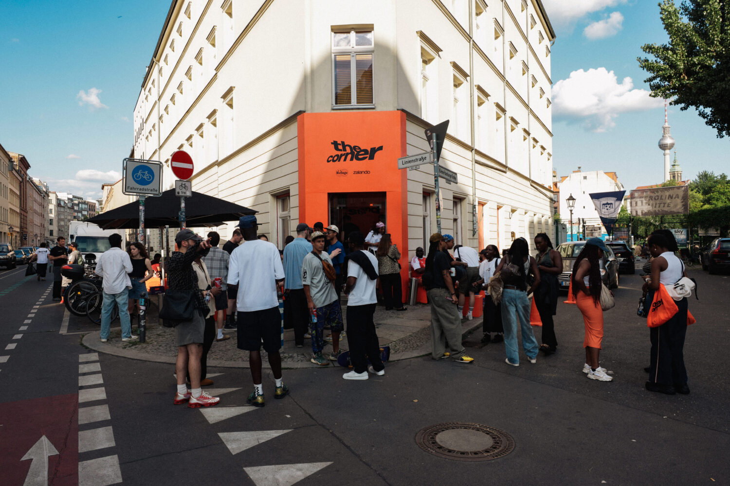 Located at the intersection of Linienstraße and Kleine Hamburger Straße in Berlin Mitte, The Corner launched as a space for creative exchange. The three-day streetwear and music experience, in collaboration with Refuge Worldwide, brought together curated retail, workshops, DJ sets, and live performances.